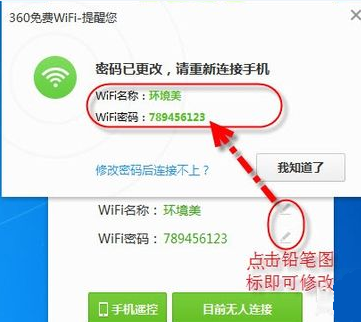 4、为了便于管理和维护,可以修改随机生成的WIFI名称和密码,点击WIFI名称及密码右边的铅笔图标即可修改您想要的名称及密码,此版本支持中文WIFI名称,此处我修改WIFI名称为环境美,WIFI密码为789456123