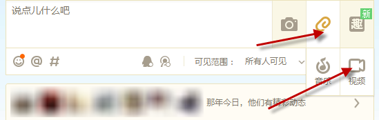 1、打开qq空间说说,在输入文字框右边第二个按钮,打开它,会出现上传音乐按钮和上传视频按钮