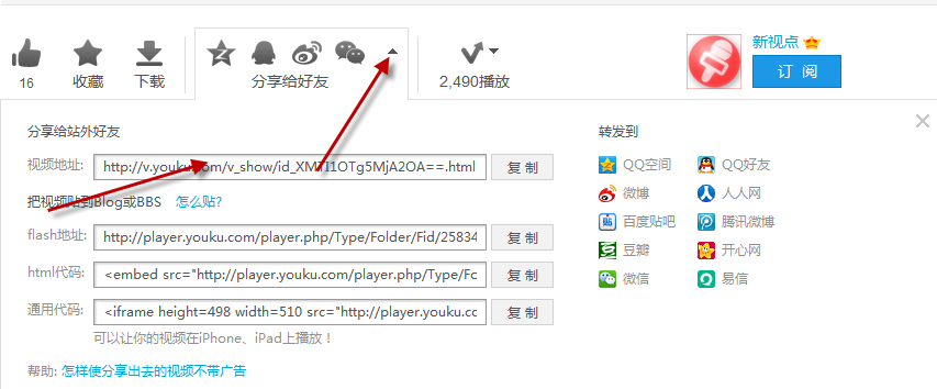 1、打开您所要上传到qq说说上的优酷视频,在优酷视频下方点开“箭头”下来菜单,会出现如下图的视频网络链接地址栏,这里选择复制第一个地址,下面还有几个地址是flash视频播放地址,网页插入的html代码