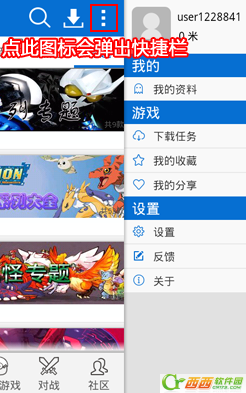 5、右上角的三个图标分别代表“搜索”、“下载列表”、“快捷选项栏”,触摸就可以进入,如图