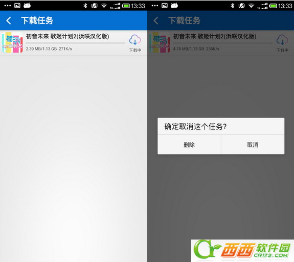 9、游戏下载中途,可以触摸界面右上角的图标进入下载任务管理页面。在此处,触摸名字右侧可进行继续“下载/暂停”下载的切换,触摸游戏名字并确认之后就可以取消游戏的下载