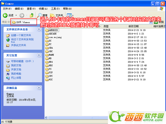 13、这里显示的本地游戏目录是:SD卡:\Games\,接下来要将手机连接到电脑,进入这目录,这时可见Games文件夹下以机种为别建立了数个文件夹,如下图