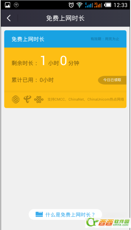 4、点击手机屏幕下方菜单栏的【我】——【免费上网时长】可以查看本机的免费上网时长。
