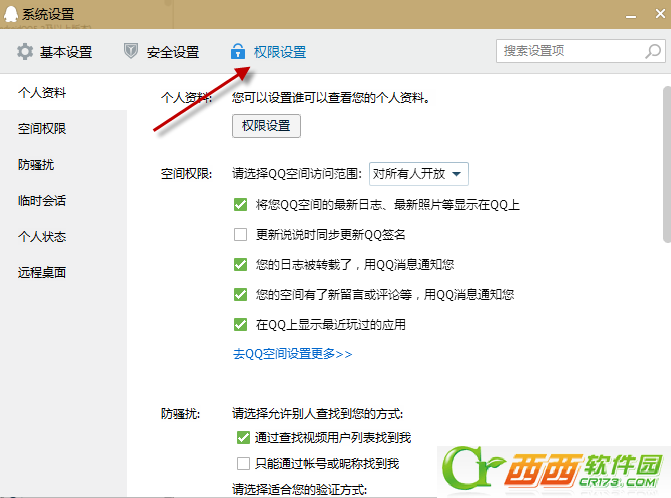 4、点击个人资料的权限设置