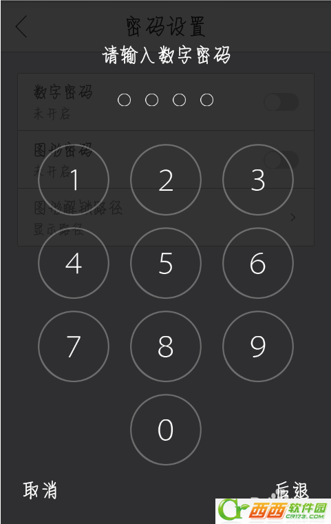 4、进入锁屏精灵的设置界面,点击密码设定,选择数字密码或图新密码,设置成功后会弹出一个密码备份建议备份到你的邮箱,避免忘记