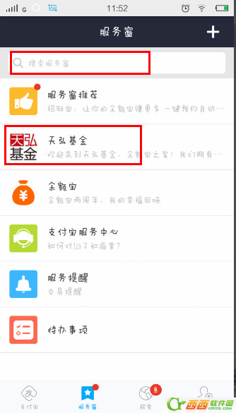 2、进入服务窗之后,大家卡看自己的服务窗项目中有没有“天弘基金”,如果有那么大家可以直接点击进去,如果没有就去搜索框中搜索添加即可