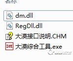第二行:将dm.dll(也就是大漠插件)释放到插件文件夹里的“dm”文件夹内,注意不要直接释放到插件文件夹,那样会注册失败。(大漠说明文档上给出的是把两个dll都释放到C盘某文件夹,但我觉得无端给用户C盘添加个什么东西不太好,会引起用户的怀疑,而且又释放了个RegDll.dll,的确多余,故改成单独把“dm.dll”释放到插件文件夹的“dm”目录下)