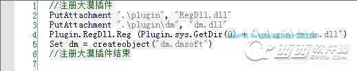 第一行:将Regdll.dll释放到同目录下的按键精灵插件文件夹,等下要用这个将大漠插件注册到系统(“.\plugin”中的“.”表示的是当前文件夹)