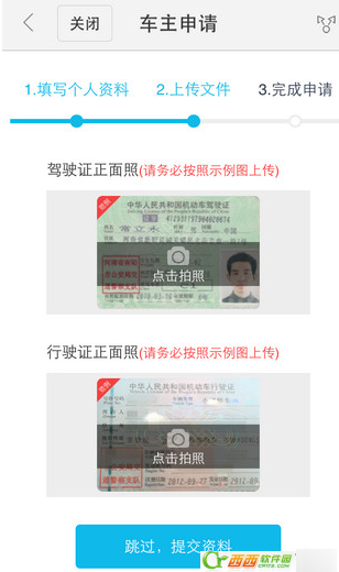 4、在这里需要用手机把驾驶证与行驶证的照片上传,如果这两个证没带在身上也不着急,可以事后补上。上传完后点击提交