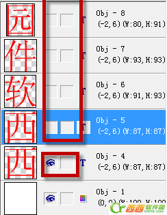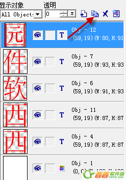 4、在“对象管理面板”中依次单击复制按钮,复制4个相同的对象,单击这些对象,将五个图层的文字修改成“西西软件园”
