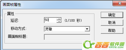8、在“画面帧属性”窗口中,将延迟时间设置成50,当然可以根据自己的喜好进行设置。