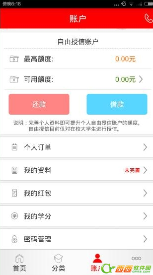 3、在账户界面,您可以查看您的最高额度和可用额度,借款,还款,个人订单,资料,红包等等