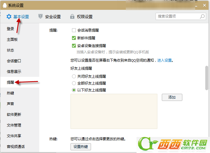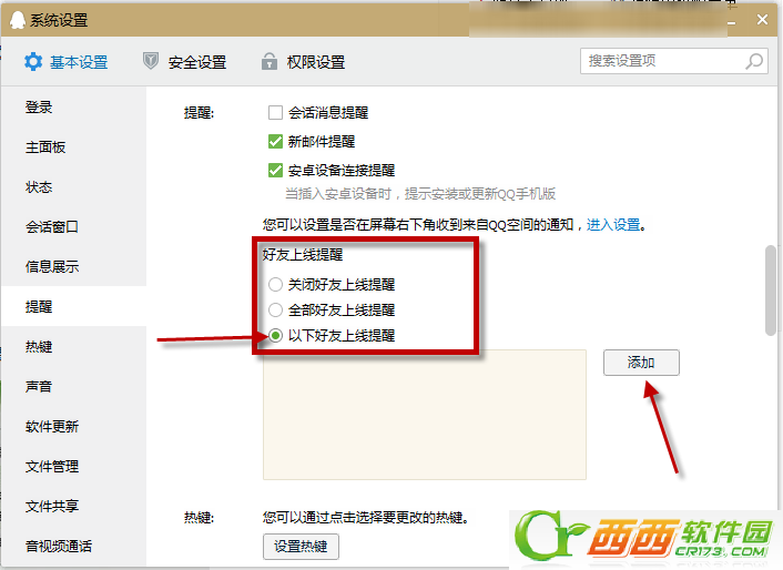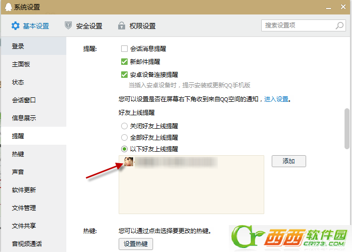 4、可以看到有个好友上线提醒,您选择以下好友上线提醒,点击添加
