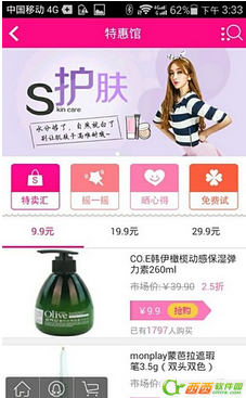 到特惠商城抢特卖单品、摇一摇得优惠奖励、分享show以及申请免费试用等,在线支付,查物流信息等。