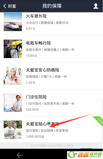 2、单击我的保障之后会进入到保障列表,此时我们将页面往下拉,就会发现有一个“关爱宝贴心养老险”选项,选择该选项。