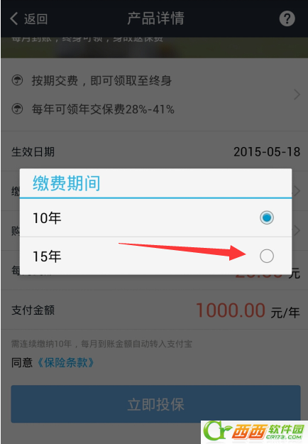 4、单击缴费期间选项之后会弹出一个对话框,此时会有两个选项供我们选择,一个是10年,一个是15年,如果要购买15年的话,那么单击“15”选项。