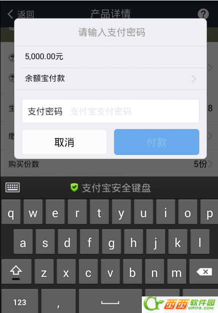 8、选择立即投保选项之后就会进入到付款面板,此时就会弹出一个对话框,让我们输入支付宝支付密码,我们输入完成之后单击"付款”按钮即可购买养老保险。