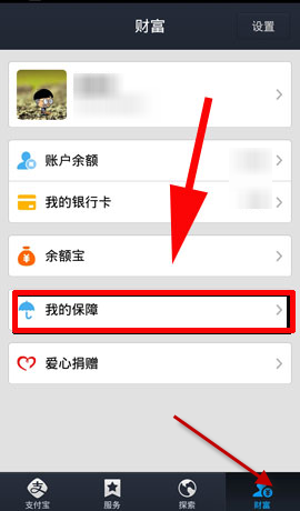 1、首先我们需要先打开支付宝钱包,打开之后登陆我们自己的账号,登陆成功成功之后我们先进入到“财富”控制面板。在这个面板上会有一个“我的保障”选项,单击该选项