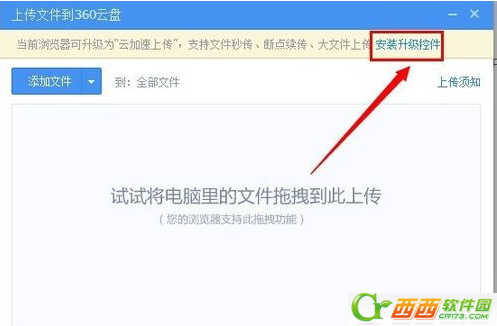 2、在打开的“上传文件至360云盘”界面中,点击“安装升级控制”链接。