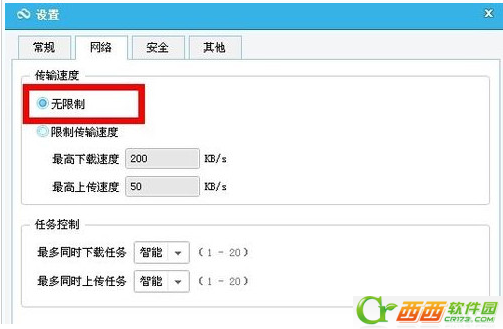 3、打开设置选项后,进入到设置的控制面板,点击“网络”这一选项,选择传输速度下面的“无限制”选择无限制后,按确定即可