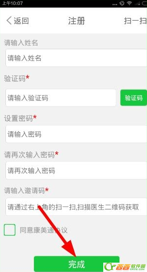 2、在注册界面,输入手机号,姓名,验证码,密码,和邀请码5153,同意康美通协议书,点击完成,就成功注册