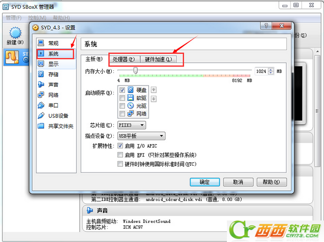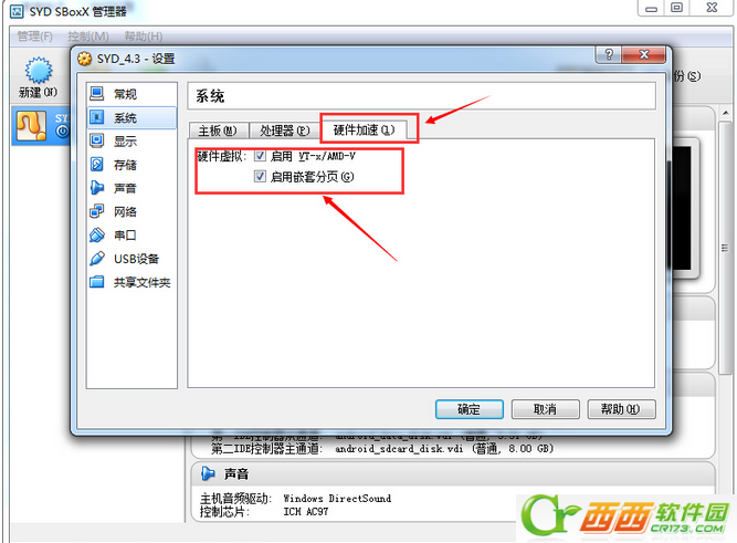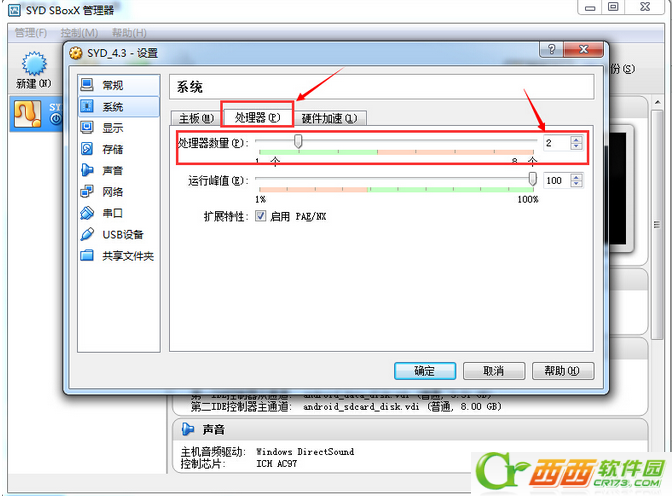 4、进入设置界面后,先系统设置,在处理器选项的处理器数量拉到2,硬件加速选项内打上勾。再确定保存。