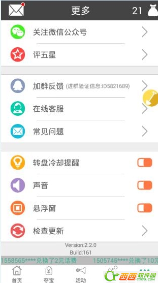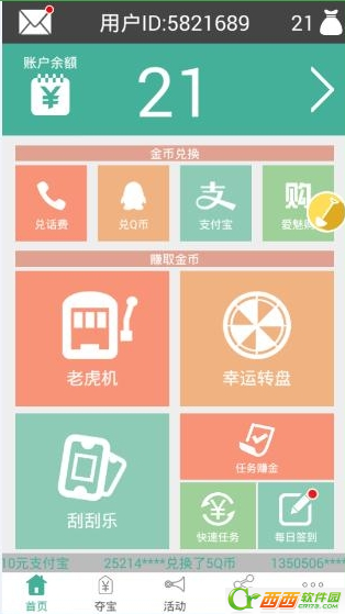 1、打开马上赚钱app,在首页上有着签到,转盘,刮刮乐,老虎机,分享赚金币,做任务赚金币,然后可以充值话费,兑换Q币,充值支付宝或者兑换各种优惠券各模块
