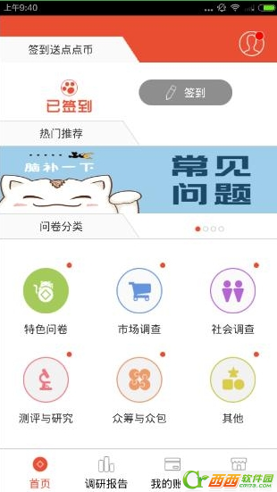 1、在首页上,有着特色问卷,市场调查,社会调查等模块,在这里您可以填问卷赚钱