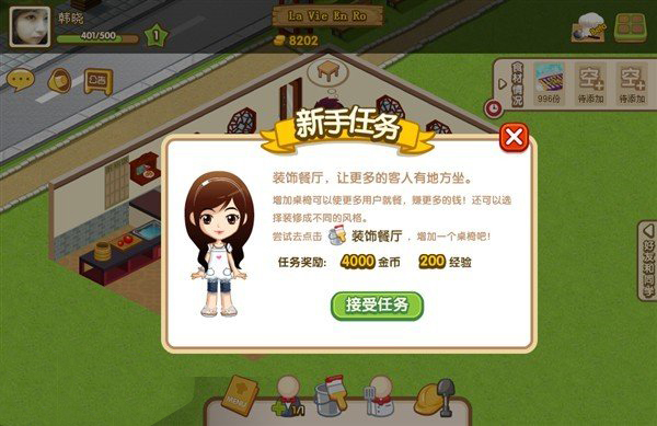 第九张图是餐厅装修任务,只要在下面的从左边往右数第三个就是装修了在里面一个张最便宜的桌子 放在餐厅里面点确定就可以了,