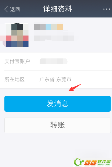 6、进入到某好友的详细资料面板后,我们在该面板中找到“发消息”功能按钮并点击它。
