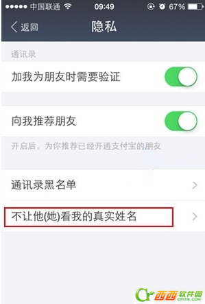 4、接下来,在其隐私界面找到不让他看我的真实姓名,点击进入