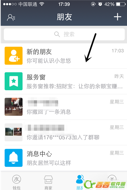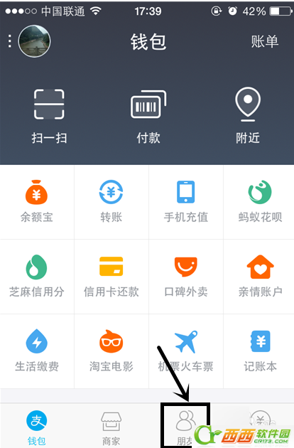 2、打开支付宝钱包,进入主界面,在下方的选项卡中选择朋友