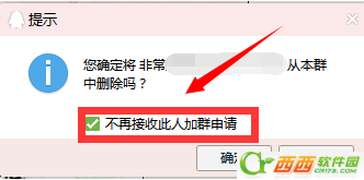 3、细心的小伙伴们也许已经发现了,在删除提示中有一个【不再接收此人加群申请】的提示,接下来我们只需在前面的方框内打勾就行啦,然后点击【确定】即可!
