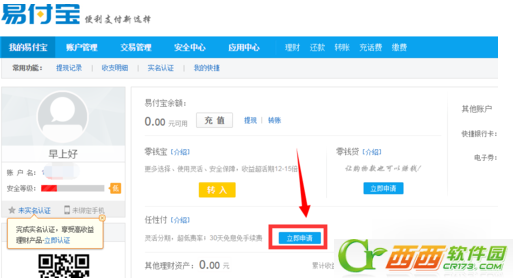 2、待进入“易付宝”官方网站后,点击“我的易付宝”选项卡界面,点击“任性付”右侧的“立即申请”按钮。
