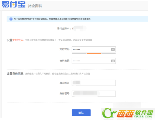 4、待进入“资料补全”界面后,输入“支付密码”、“姓名”和“身份证号”,以完成实名认证操作。