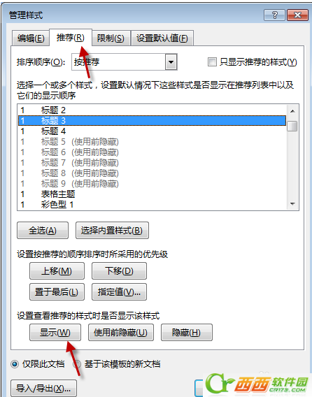 3、在“管理样式”对话框中,选“推荐”选项卡,在选择框中找到标题n(使用前隐藏),选中后点下方“显示”按钮。确定后退后即可。