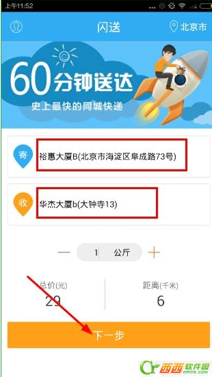 1、打开闪送app,在首页上完成既和收的地址,点击下一步
