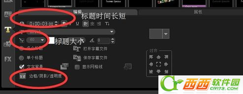 4、之后你看到右方会调出一个字体面板,在面板里面可以调整标题效果时间长短,标题大小,文字背景、边框、透明度等等