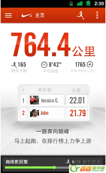 分享你的跑步记录,让朋友一路为你加油,激励你勇往直前。 秀出你的 Nike+ 等级颜色,只要按下按钮,即可通过激励歌曲让自己马力加倍。