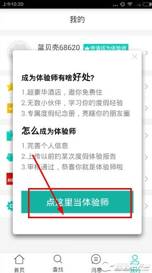 2、会出现提示,为你详细的介绍了成为体验师有什么好处,怎么成为体验师的流程,看完后,就可点击当体验师;