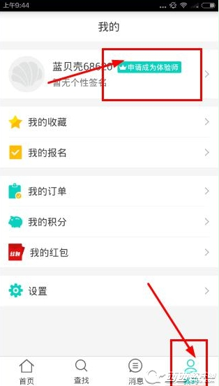 1、打开彩贝壳app,先注册后,点击我的,再点击上方的申请成为体验师