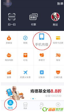 一、打开手机支付宝,在“钱包”页面点击“手机充值”。