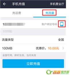 二、在“手机充值”页面,点击“充流量”。这里默认充流量的号码为账户绑定号码,如果想为他人充流量可以点击号码右侧的手机样式的图标,更换充流量的手机号码。