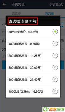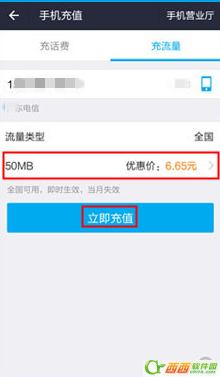 三、选定充流量的手机号后,还可以点击左图流量数和价格的地方,进入“请选择流量面额”页面,进行充值流量和价格的选择,选好后点击“立即充值”。
