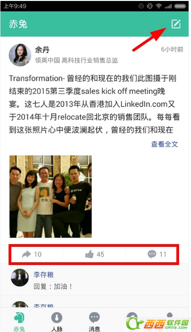 1、打开赤兔首页,你将会看到职场中其他人的动态,你可以分享、点赞、评论。