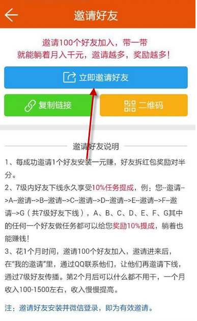 成功邀请一个好友微信登录一元赚,您和好友将立即随机获得0.2-1.5元现金,7级内好友下线奖励10%任务分成,例:您—邀请—>A—邀请—>B—邀请—>C—邀请—>D—邀请—>E-邀请->F-邀请->G(共7级好友下线),A,B,C,D,E,F,G其中的任何一个好友做任务都可以给您奖励10%提成,躺着也能赚钱!