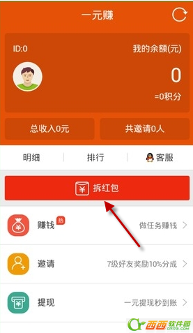 1、打开一元赚手机软件,从首页点击“拆红包”