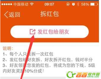 2、进入拆红包界面,点击“发红包给好友”,好友领取您发的红包,将成为您的下线,利用红包吸引用户,成功率更高!