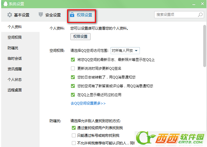 3、 点击权限设置以后进入到权限设置窗口,在权限设置窗口左侧点击防骚扰