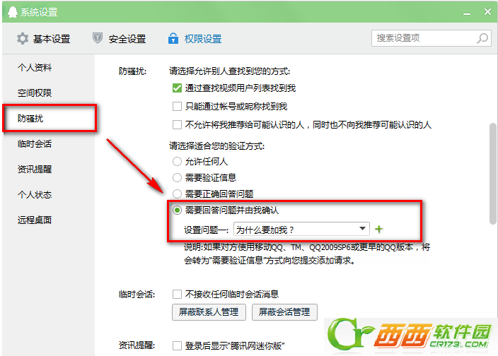 4、点击防骚扰之后进入到防骚扰窗口,在窗口上面点击选择需要正确回答问题,设置一个问题,好友需要正确回答问题之后才可以添加你为好友。之前的旧版本中有不允许任何人的选项,现在最新版QQ没有了,我们可以选择需要正确回答问题并由我确认选项,然后设置多个问题,最好是设置别人不知道的问题,这样就不会有人成功添加你为好友了
